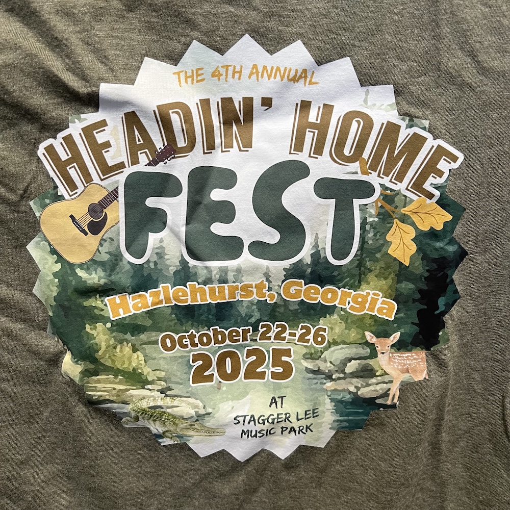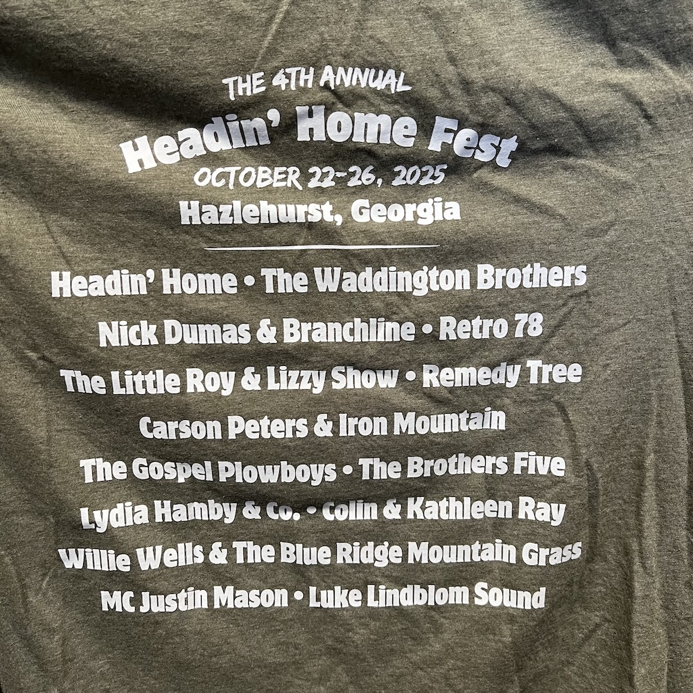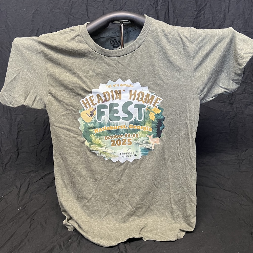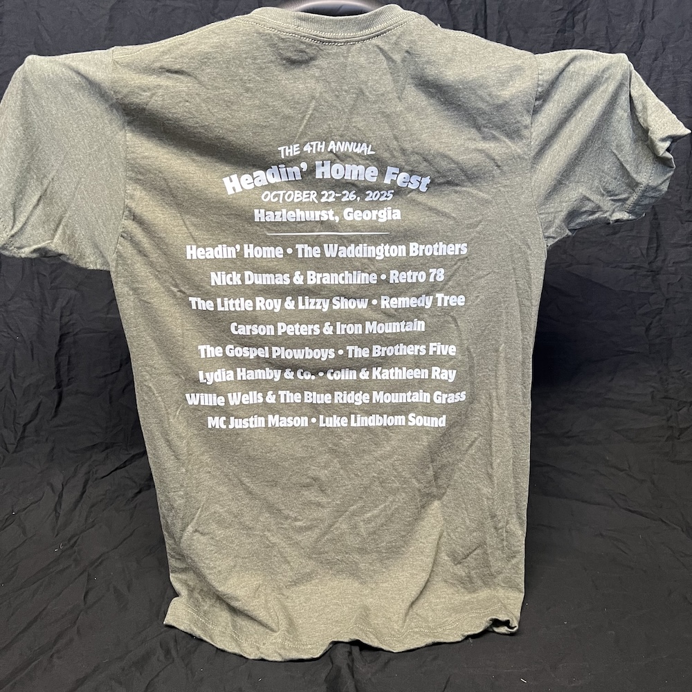 We have a limited amount of all sizes (XS – 3X) leftover in our 2025 Headin’ Home Fest tees! You can grab one now for only $10! (Big discount from original sale price of $25!) These are the softest and comfiest shirts around, in a lovely dark green color with a beautiful print featuring our new location at Stagger Lee Music Park and all our 2025 bands! Double sided, these shirts are printed on the front and back. The super-comfy 50/50 polyester and cotton blend material makes for optimal comfort. We can ship your T-shirt to you or hold it for you to pick up if you’re local.